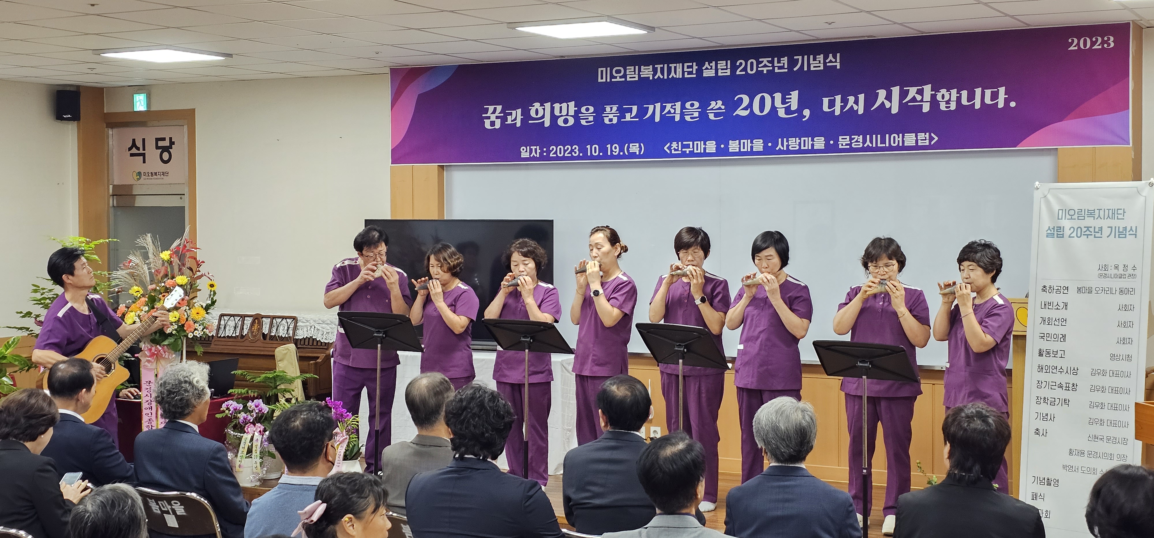 봄마을 오카리나 동아리 ‘만남’ 축하 공연 ------------------------------------------------------------------- “마음의 문을 열면 내 이웃이 보입니다”를 신념으로 김우화이사장 이순례부이사장 부부가 설립한 미오림 복지재단이 20주년을 맞이하여, “꿈과 희망을 품고 기적을 쓴 20년, 다시 시작합니다” 로 마음을 다지는 기념행사를 하였습니다.