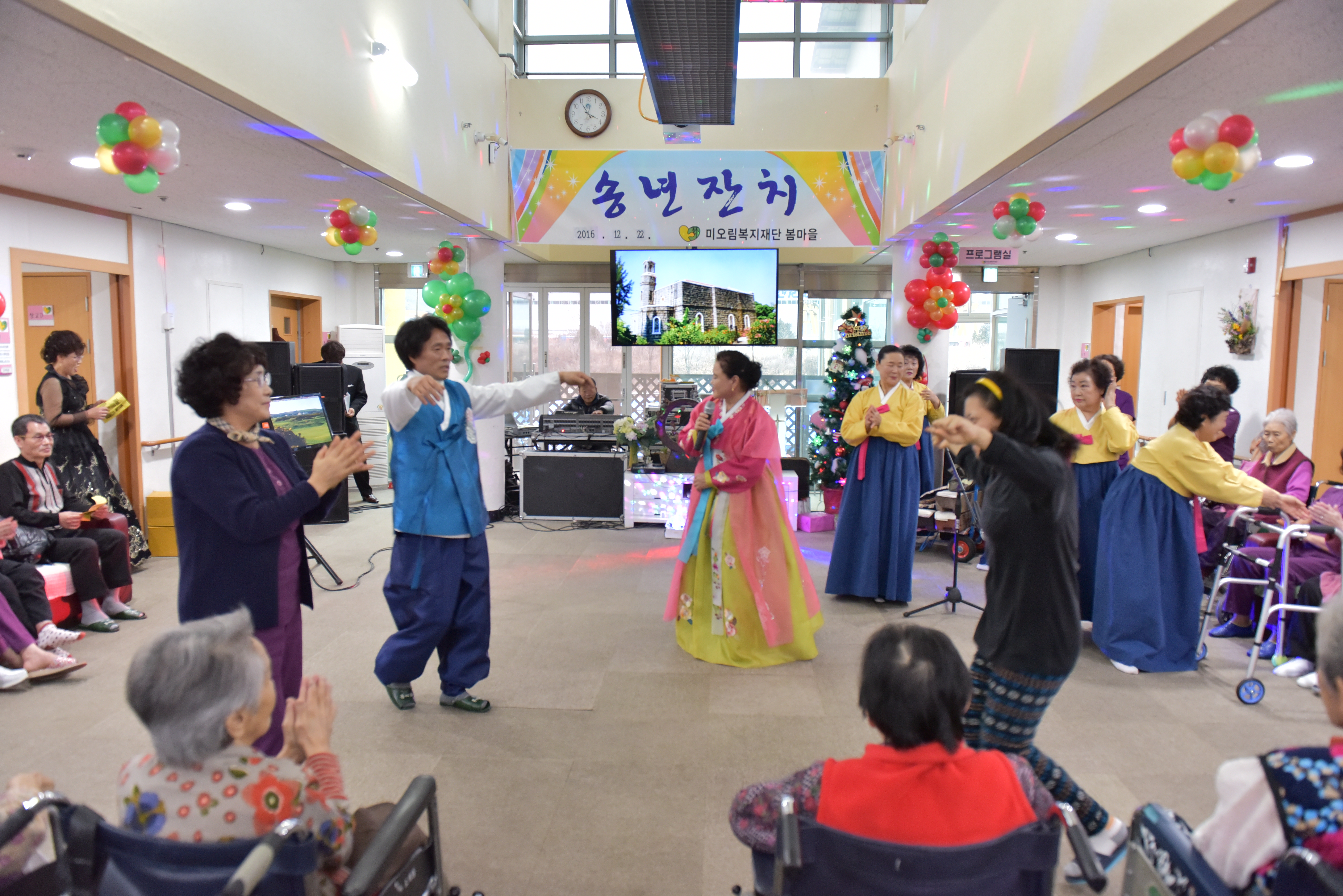 봄마을 송년잔치가 2016년 12월 22일 아리솔 예술봉사단의 재능기부와 입소자 가족, 직원이 하나로 어우러진 가운데 화기애애한 시간으로 한해를 마무리 하였습니다.