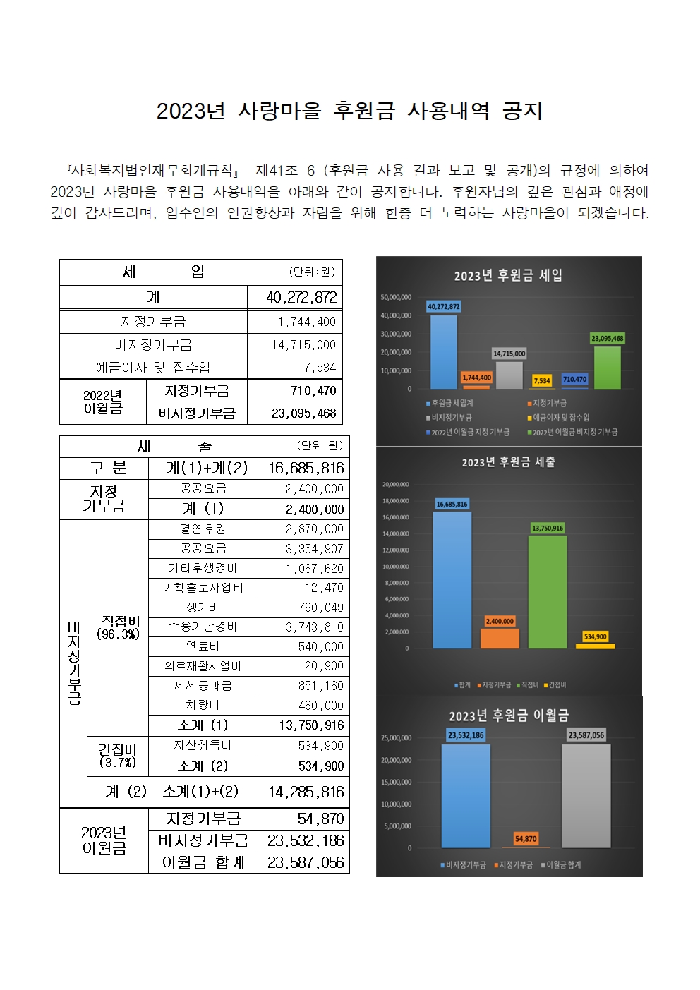 1. 공고사항:2023년도 후원금품 수입 및 사용내역