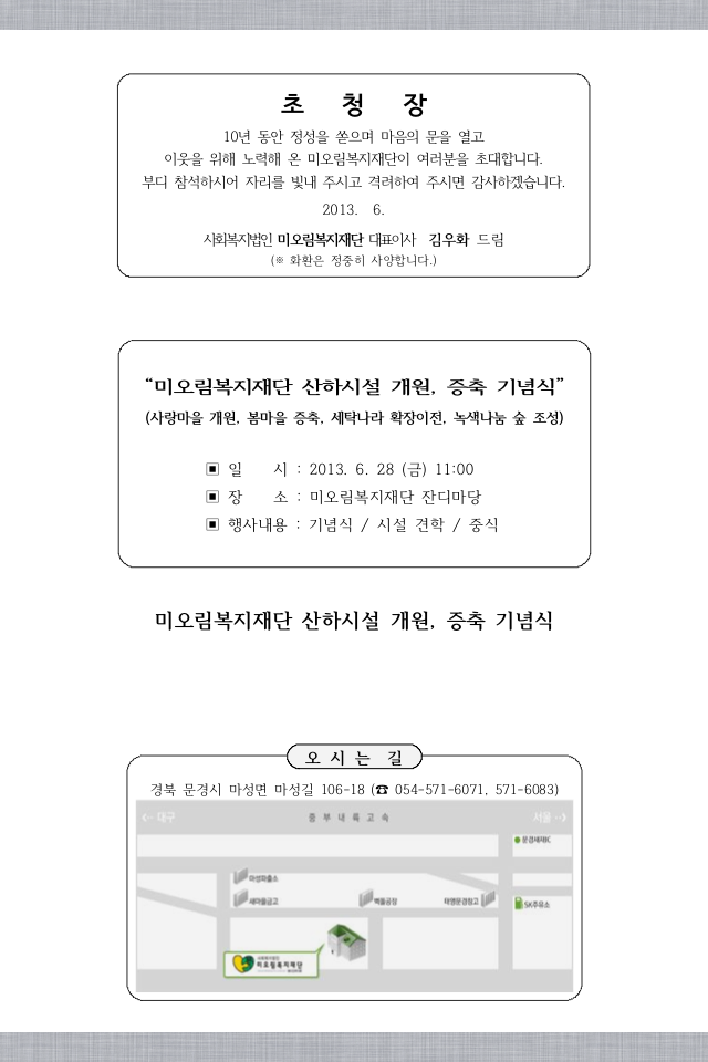 2013년 6월 28일 (금) 오전11:00 미오림복지재단 잔디마당에서 200여명의 내.외 귀빈을 모시고, 산하시설 개원, 증축 기념식을 합니다. 참가하시는 손님이나 마중하시는 직원 모두가 미오림 안에서 하나되는 아름다운 행사가 되기를 기원합니다.