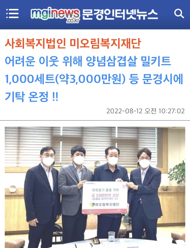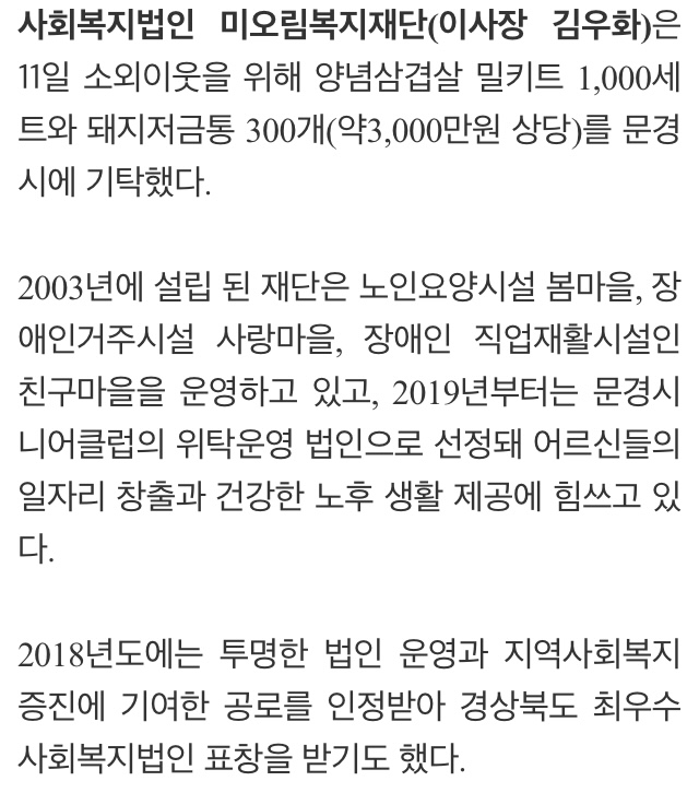[미오림복지재단] 문경시에 양념삼겹살 밀키트 1,000세트 기탁.