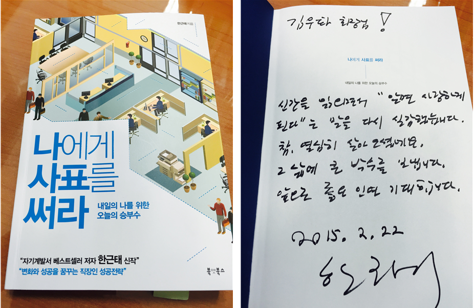 자기 계발서 베스트셀러 저자인 한근태 작가는 "변화와 성공을 꿈꾸는 직장인 성공전략"에 대한 신작(나에게 사표를 써라)을 통해서 내일의 나를 위한 오늘의 승부수를 제시하고 있습니다.