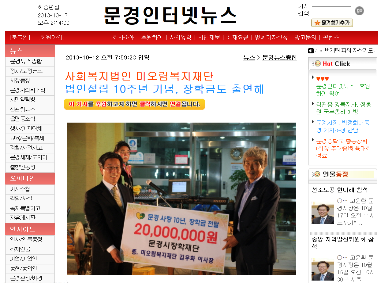 [미오림복지재단] 미오림복지재단 문경시에 장학금 전달. 아이콘 작성일 : 13년10월17일 15:51
