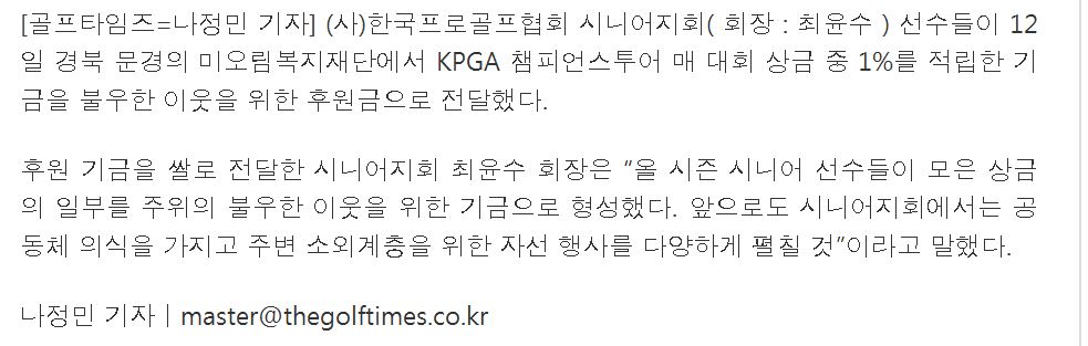 게시판 & 포토갤러리 > 자유게시판 > 골프타임즈 - KPGA 미오림 복지재단 후원 기사