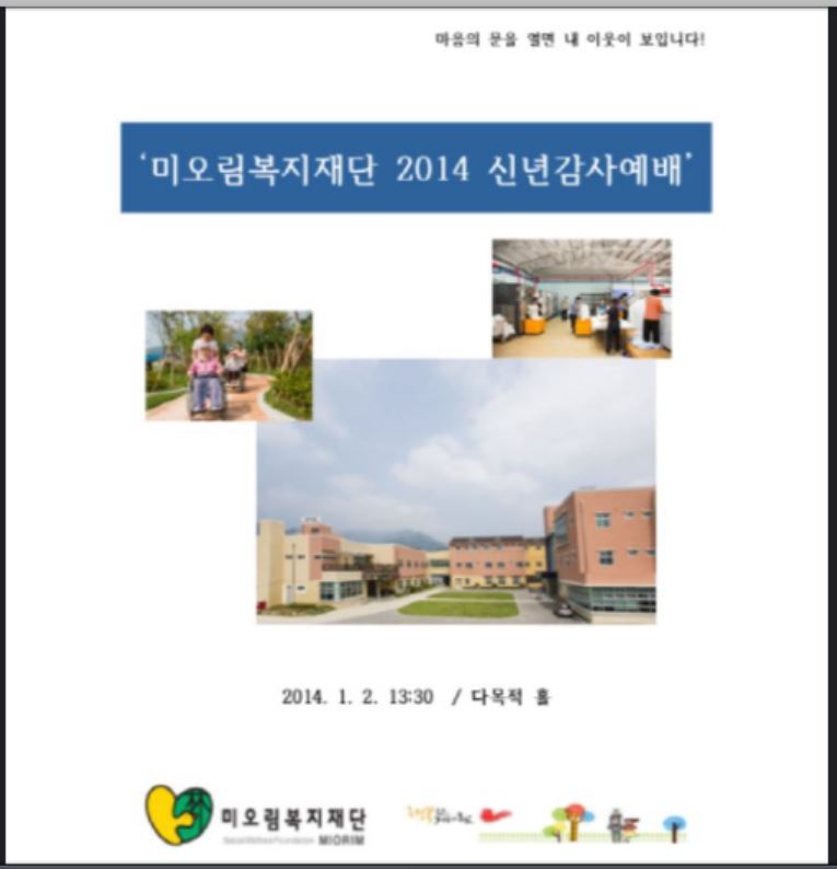 [미오림복지재단] 미오림복지재단 2014 신년감사예배 아이콘 작성일 : 14년01월13일 11:15