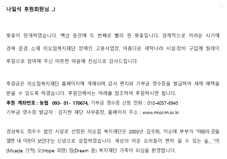 [미오림복지재단] 나일석 님의 릴레이 후원. |