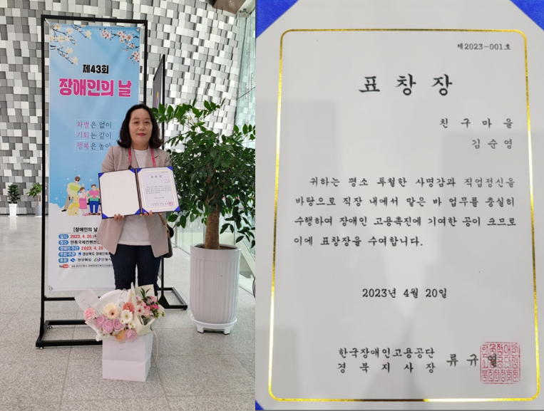 [미오림복지재단] 이용장애인 김순영 경북지사장상 표창(친구마을)
