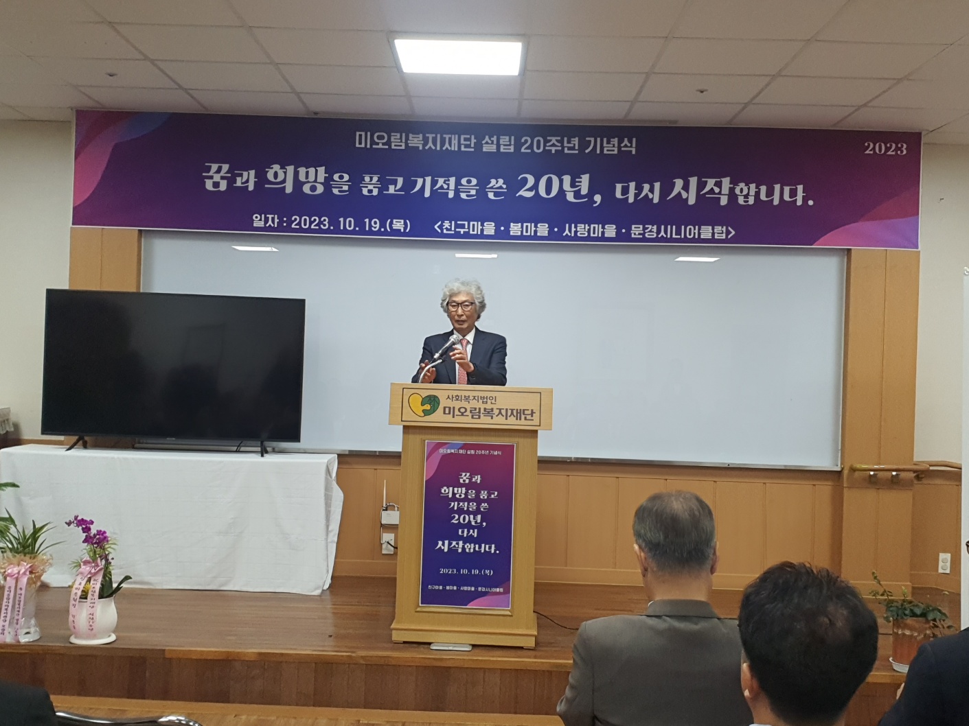 김우화 재단 이사장 기념사 ------------------------------------------------------------------- “마음의 문을 열면 내 이웃이 보입니다”를 신념으로 김우화이사장 이순례부이사장 부부가 설립한 미오림 복지재단이 20주년을 맞이하여, “꿈과 희망을 품고 기적을 쓴 20년, 다시 시작합니다” 로 마음을 다지는 기념행사를 하였습니다.