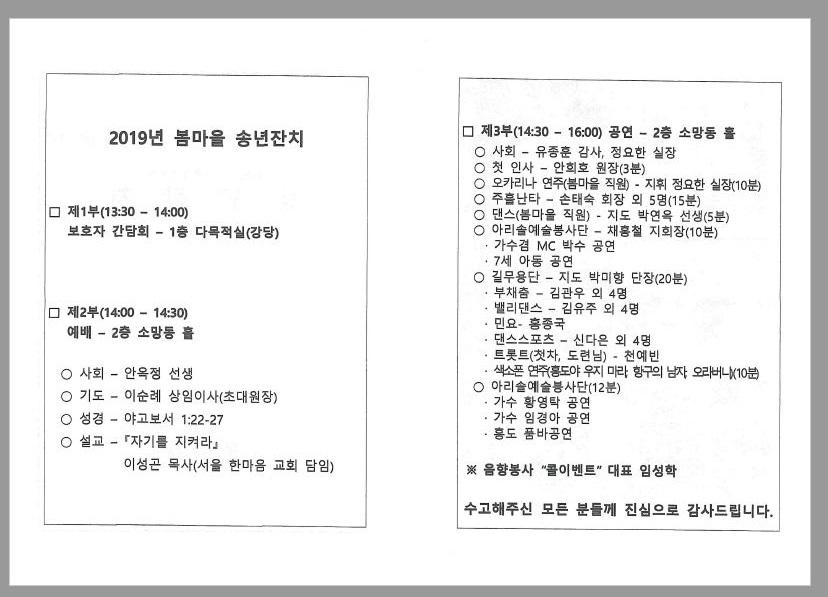 봄마을 송년잔치는 (2019년 12월 21일 13:30~16:30)