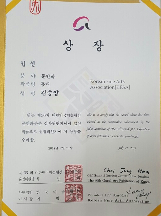 (주)루마코리아의 영업본부장 '愚岩 김승양' 전무님이 국내 최고 영예의 國展작가가 되었습니다. 작품은 문인화인 "홍매"로 대한민국미술대전에 입선한 것입니다. "좋은 일을 하면 사업도 잘된다"고 하신 김우화 재단이사장님이 말씀대로 영업도 열심히하고, 미오림의 후원을 위해서 노력하신 결실인 것 같습니다. 루마와 미오림 직원 모두 힘찬 박수로 기쁨을 함께 합니다. 짝~짝