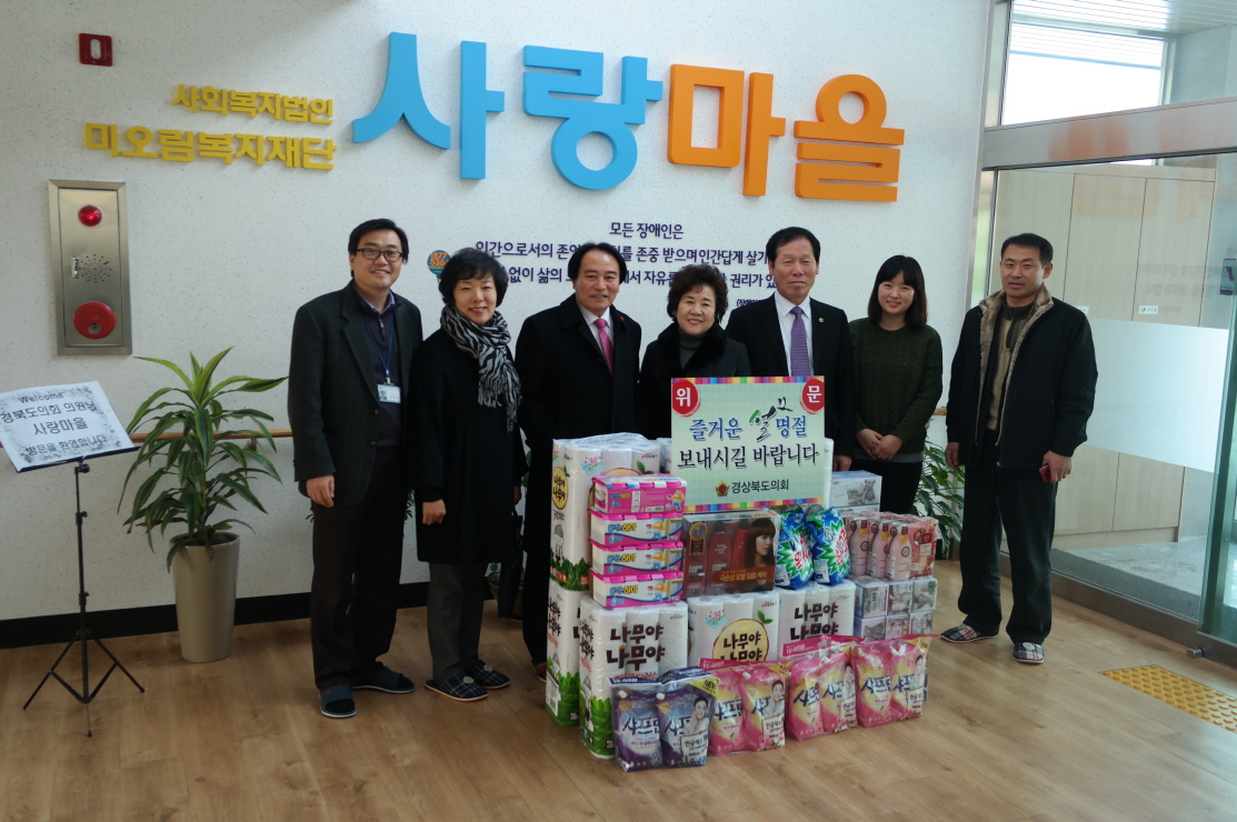 2014. 1. 21 (화) 경북도의회(이시하, 고우현, 이경임 도의원)에서는 우리시설을 방문하여 휴지, 세제 등 설 위문품을 전달해 주셨습니다. 감사합니다.
