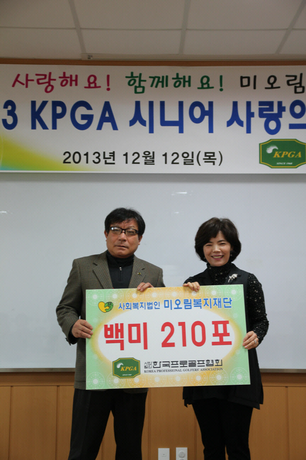( 2013년 12월 12일 KPGA 시니어 사랑의 기금 후원 ) 2013년 12월16일 9,058,490원(백미210포 상당)을 후원해 주셨습니다.