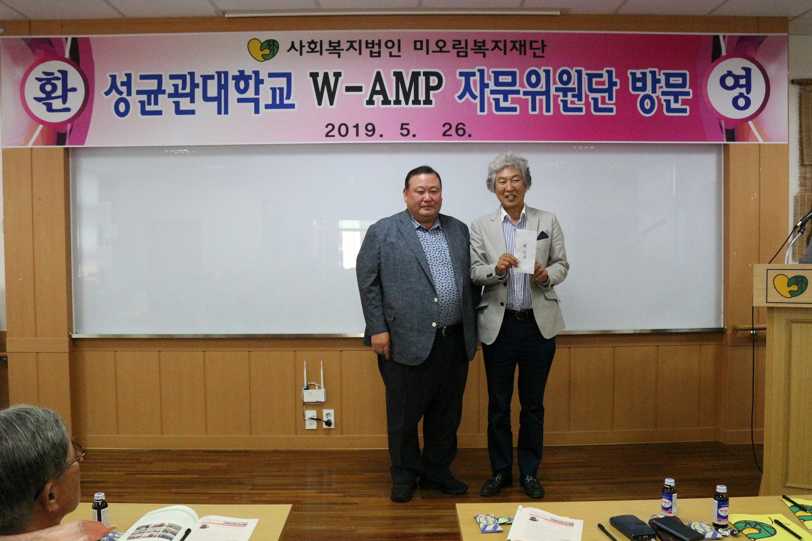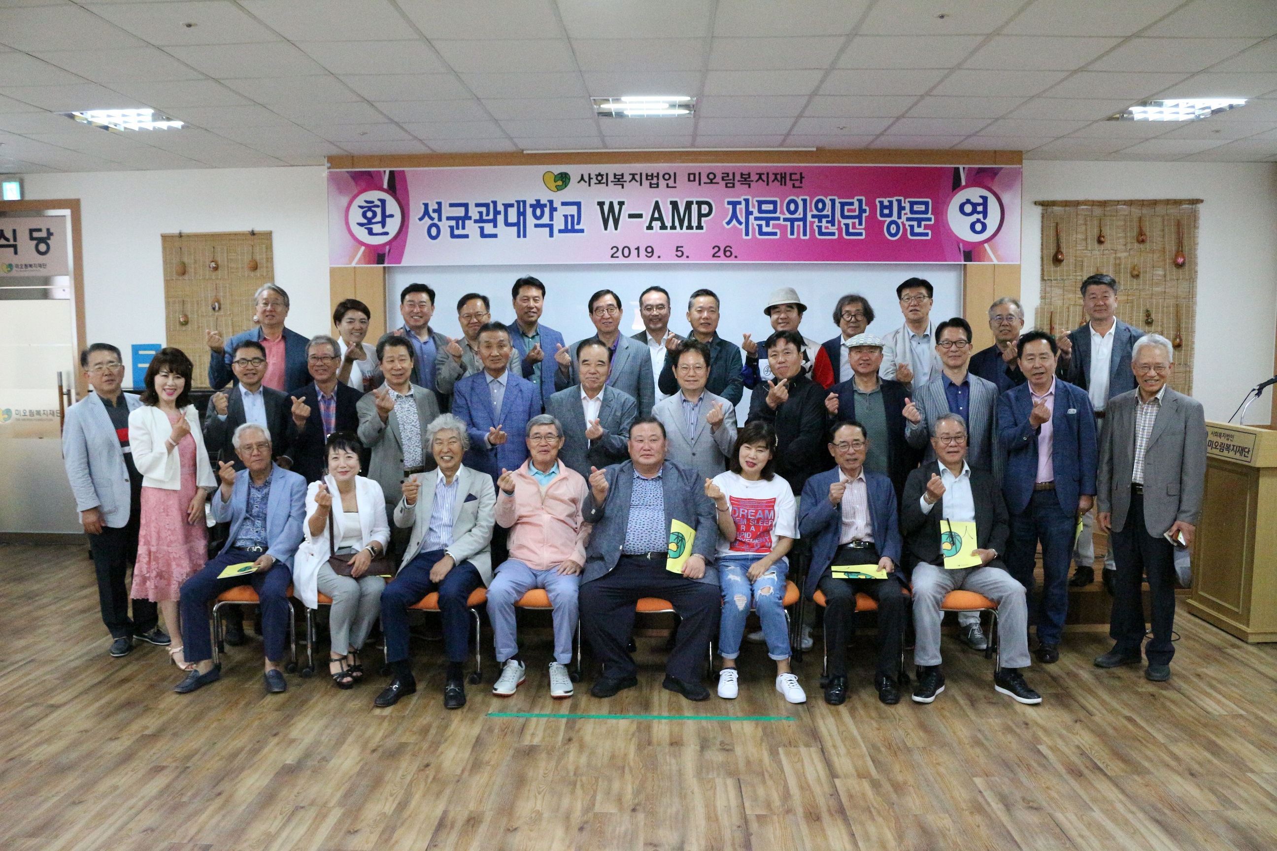 2019년 5월 26일 성균관대학교 W-AMP 자문위원단 36명이 미오림을 방문했습니다. 이동희 총회장을 비롯한 36명 회원들은 각각의 사업체를 운영하는 성공한 CEO로써 설립자의 친인척이 한사람도 재단에 근무하지 않는 투명한 운영으로 경상북도 최우수법인으로 선정 표창한 미오림복지재단을 후원 방문한 것에 대한 자긍심으로 칭찬과 더불어 지속적으로 후원을 해 주기로 하였습니다.