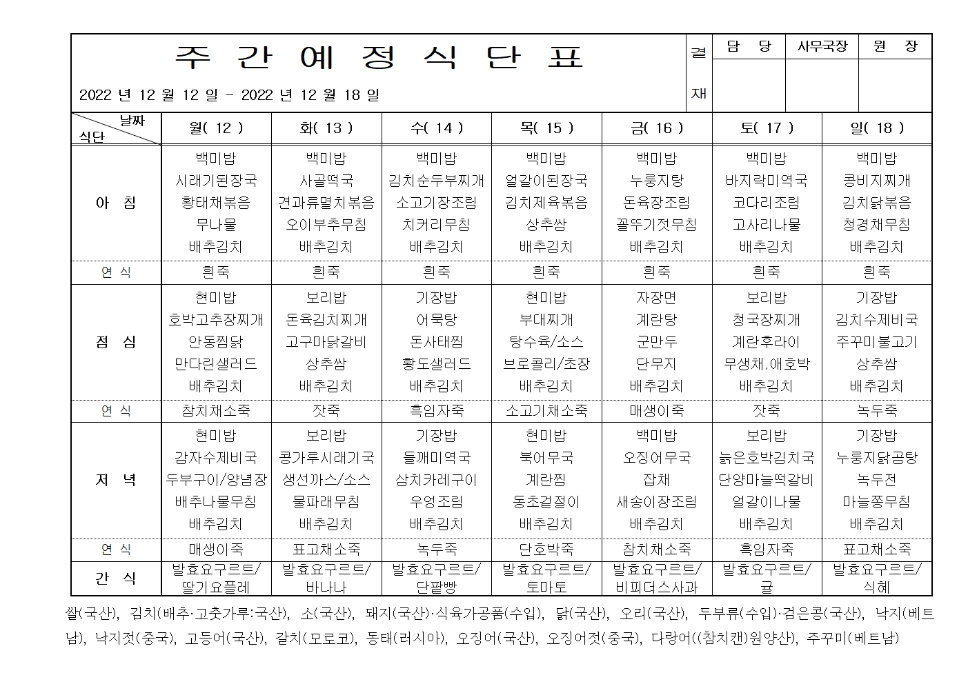 [봄마을] 주간식단 |