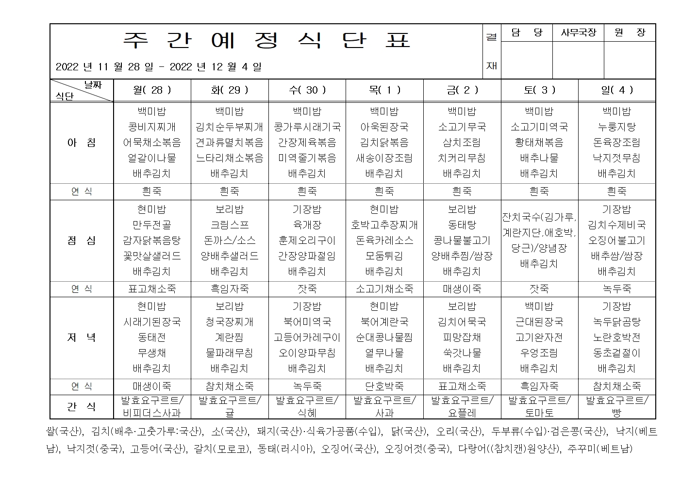 [봄마을] 주간식단 |