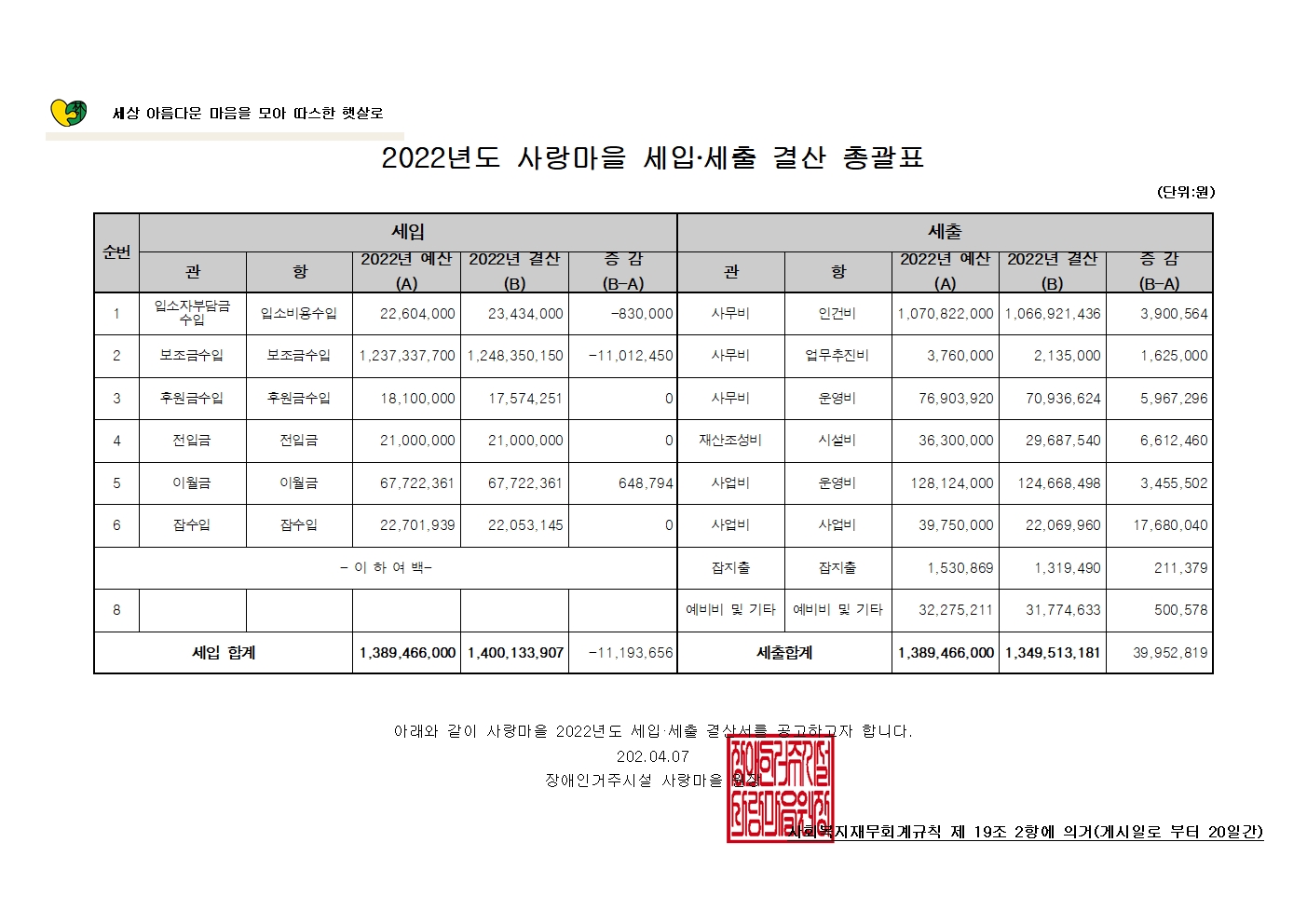법인소개 > 알림마당 > 2022년 사랑마을 세입/세출 결산 공고