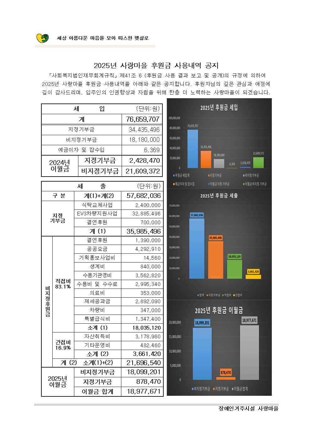 [사랑마을] 장애인거주시설 사랑마을 2025년 후원금품 수입 사용 내역 공지